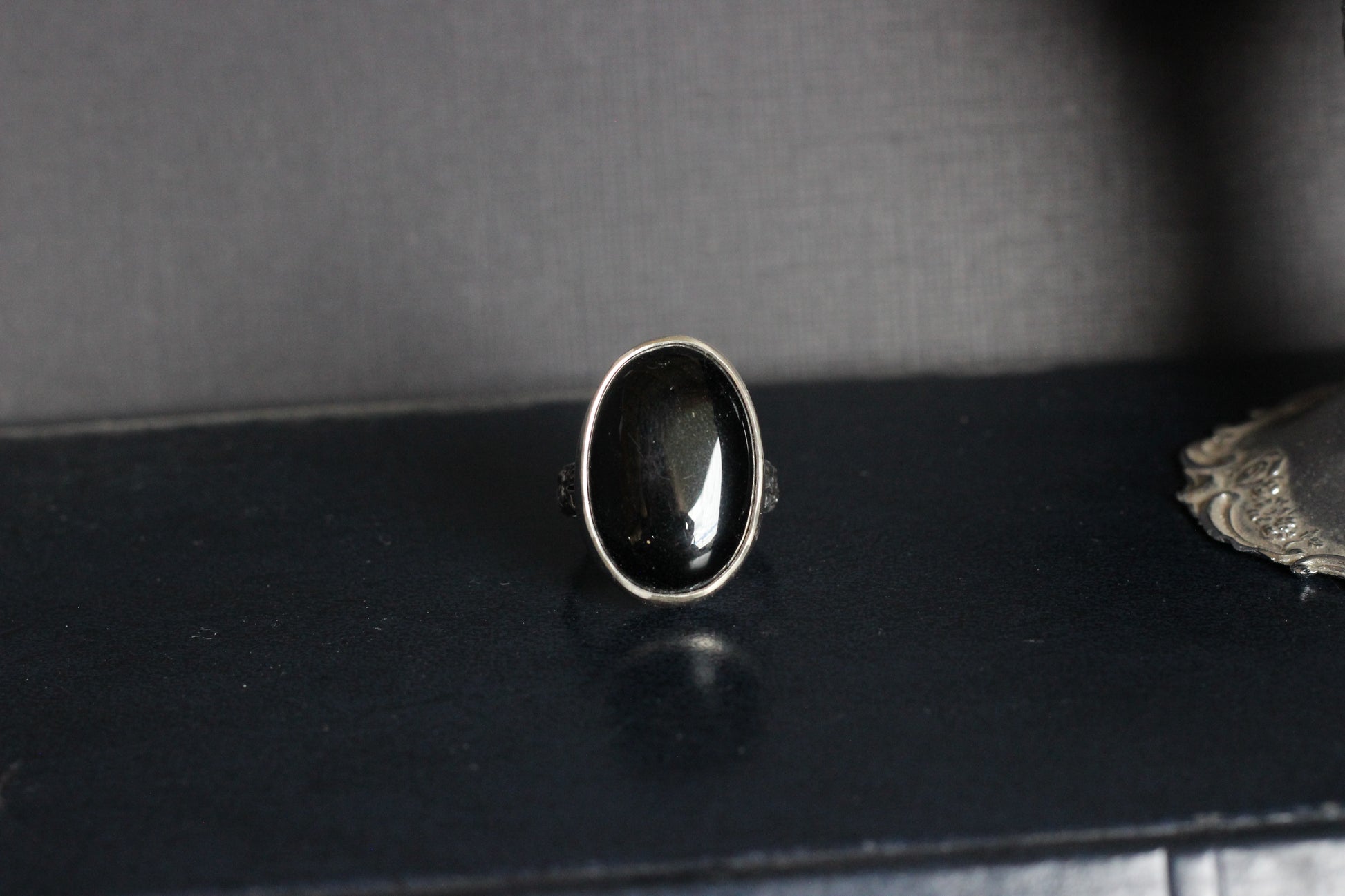 Make a statement with this large black obsidian ring. This ring features a split rose garden ring band in a size 9. This stone measures about 26mm by 16mm.