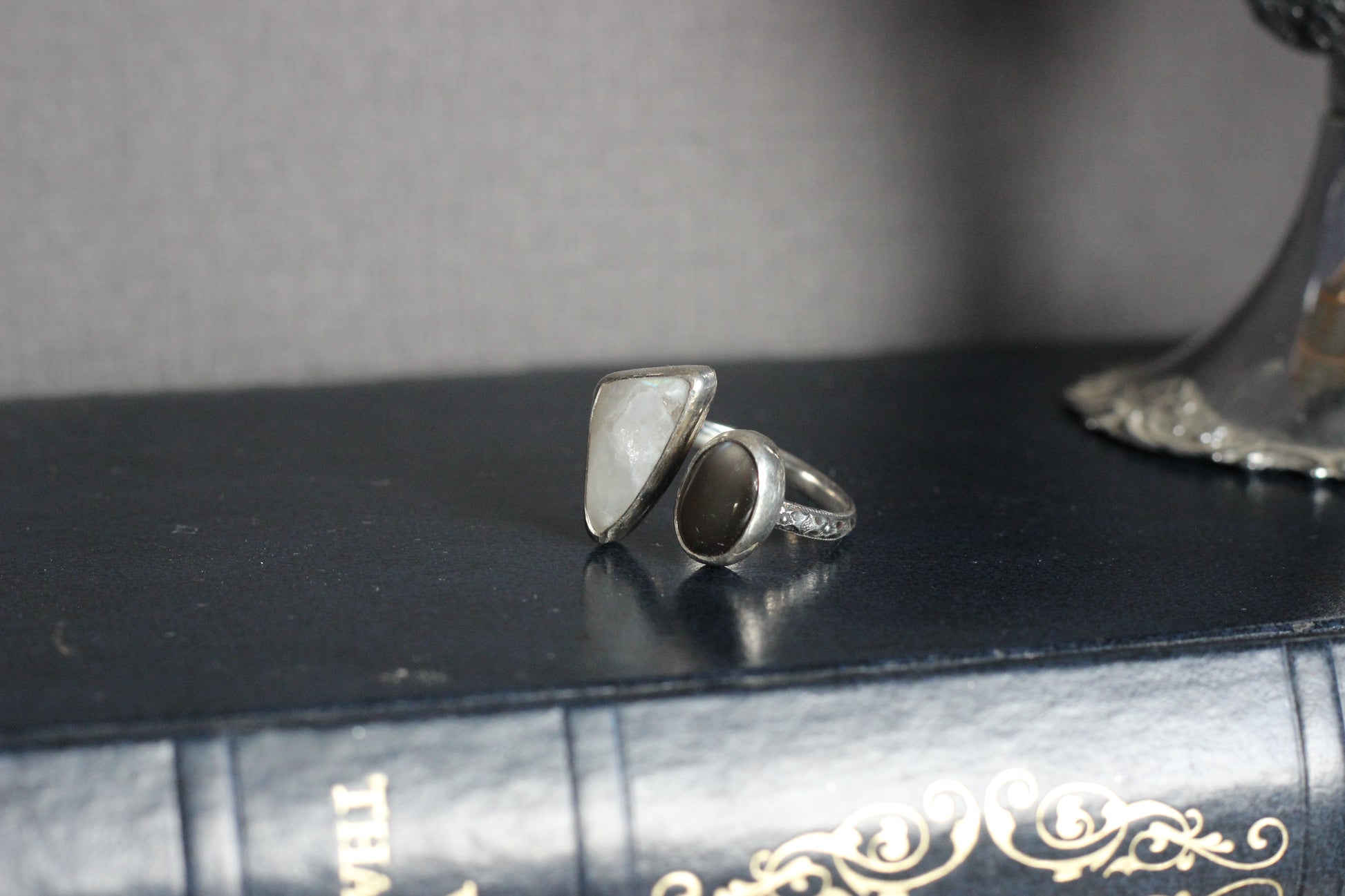 Rainbow Moonstone and Grey Moonstone make the perfect duo for this adjustable ring. Set in sterling silver, this ring showcases the light and dark side of moonstone.
