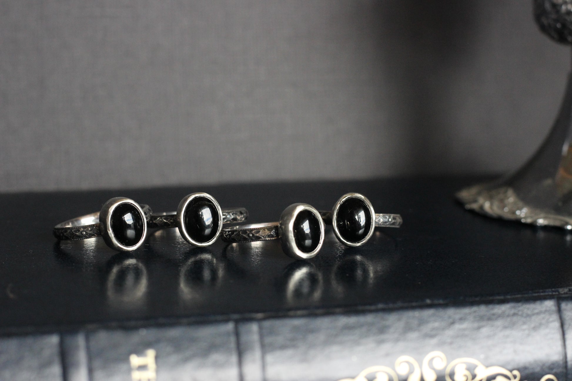 The new moon ring is straight from the addams family's jewelry vault. Set in sterling silver, with a beautiful pattern band that catches the light. This ring is a midsize ring, bigger than the starry night ring, but not a statement size.