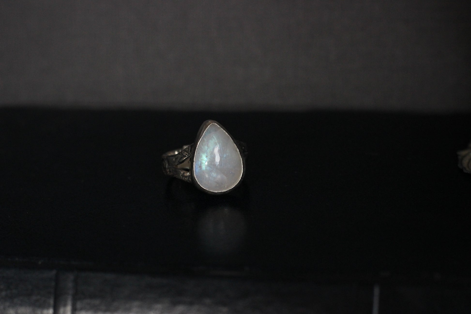 If you love rainbow moonstone and flowers this ring is for you! This flashy blue rainbow moonstone is set in sterling silver and has a size 8 floral split ring band.