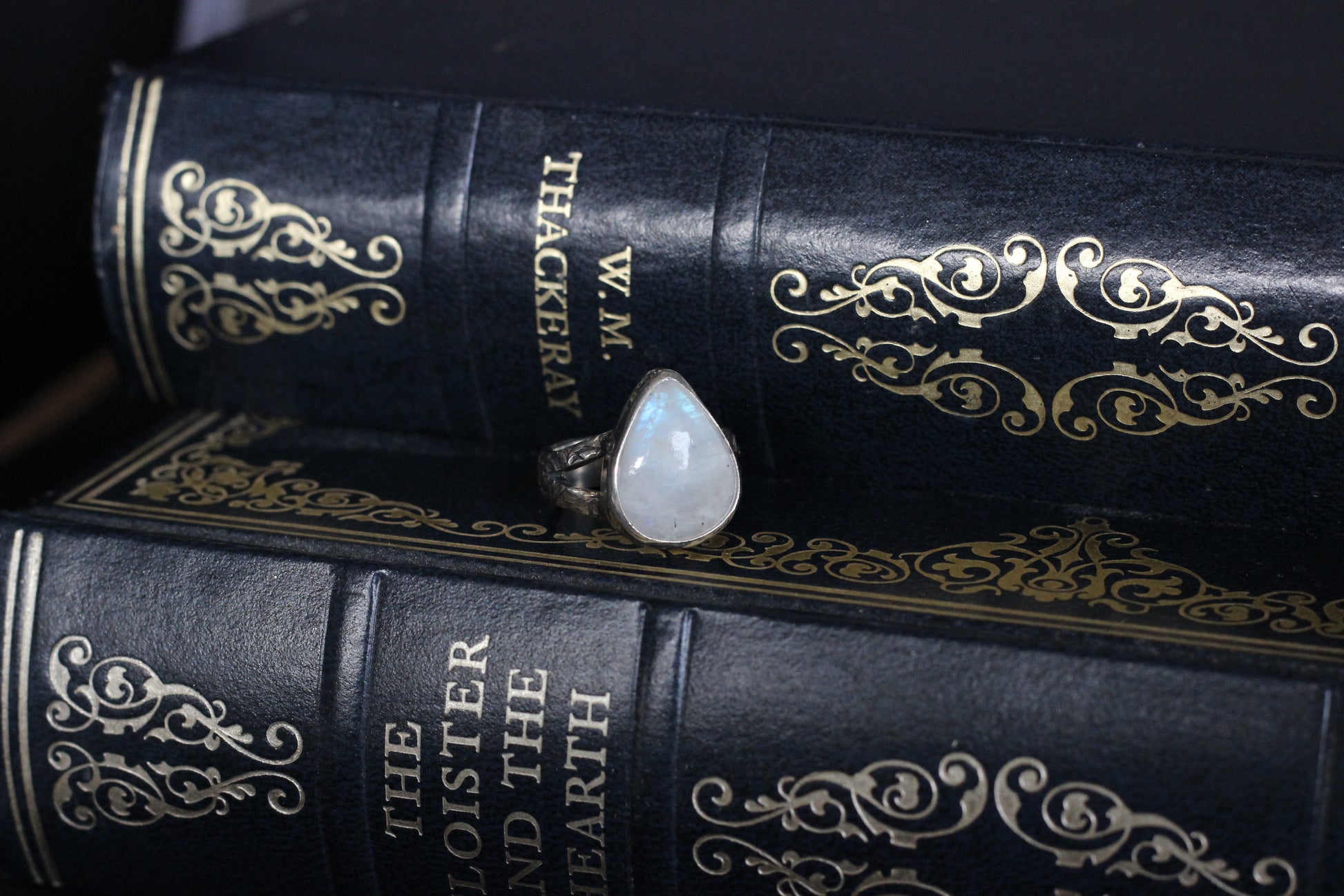 If you love rainbow moonstone and flowers this ring is for you! This flashy blue rainbow moonstone is set in sterling silver and has a size 6 floral split ring band.