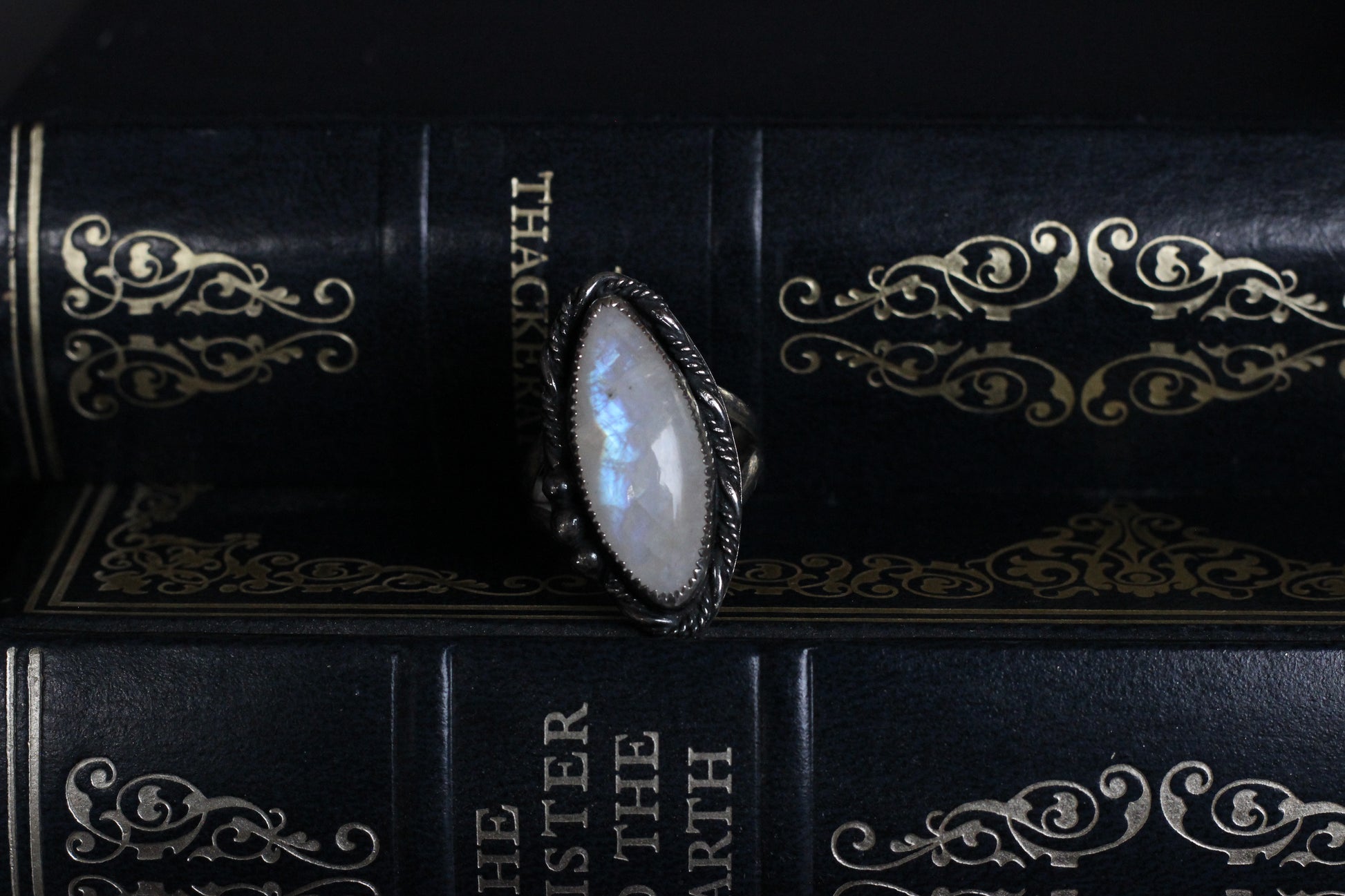 This western inspired ring features a marquis rainbow moonstone set in a serrated sterling silver bezel. Surrounding the stone is a triple braided border with three silver pearls. The stone and setting measures about 38mm by 16mm. This ring features a comfortable and sturdy split ring band in a size 10.