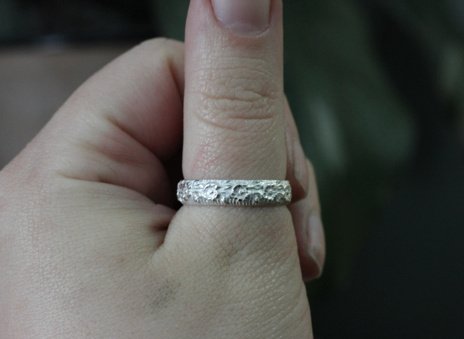 This band was made for the kind of woman who finds beauty in the untamed. A continuous wild rose pattern wraps all the way around a 5mm sterling silver band — detailed, textured, and meant to be worn every single day.