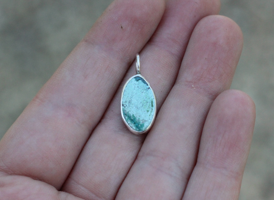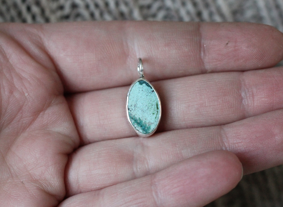 Take a piece of summer with you with this light blue turquoise pendant. This gem is set in sterling silver and is 22mm by 20mm.