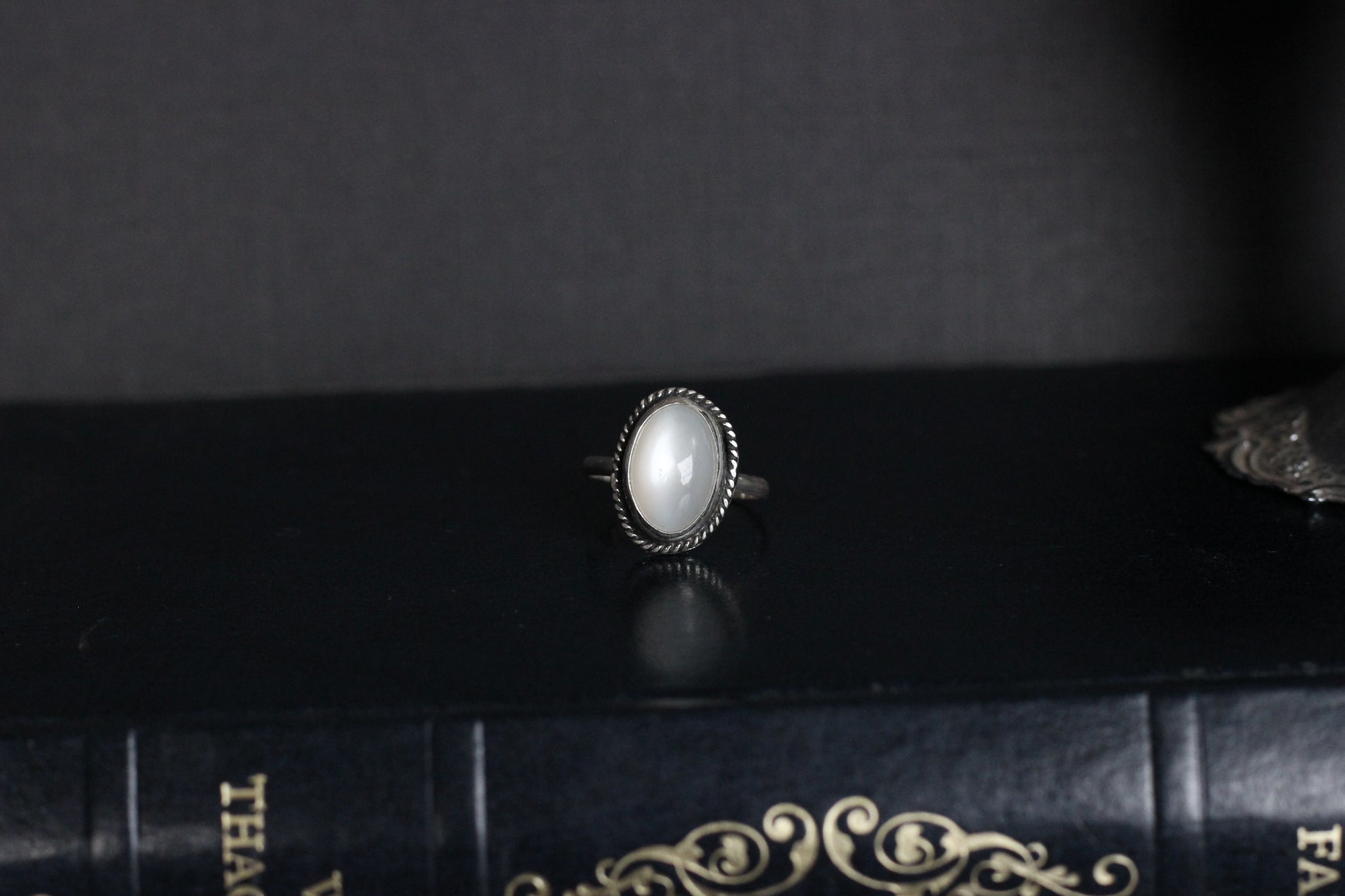 This shimmery white moonstone is set in sterling silver with a rope border. This ring has a smooth half round band in a size 8. This stone and it's setting measures about 16mm by 11mm.